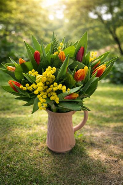 This beautiful spring bouquet features vibrant tulips in warm shades of red, burgundy, pink, orange, and yellow, paired with cheerful yellow mimosa flowers. The mix creates a bright, cheerful arrangement that celebrates the season.