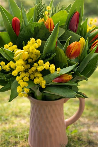 Perfect as a centerpiece for your table or as a thoughtful gift, this arrangement captures the warmth and beauty of spring. The combination of elegant tulips and delicate mimosa creates wonderful texture and visual interest that will brighten any room.​​​​​​​​​​​​​​​​