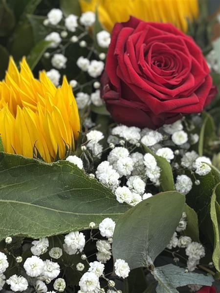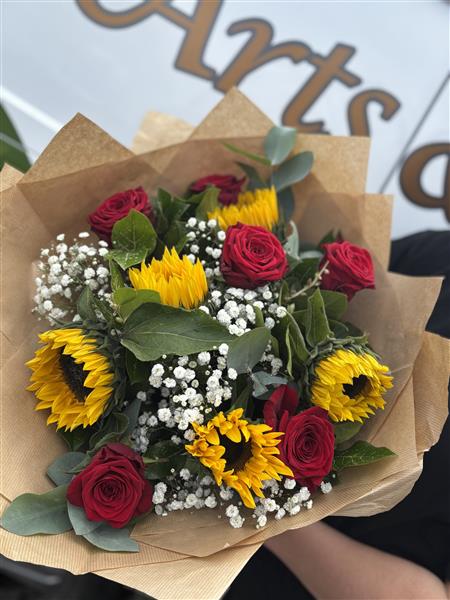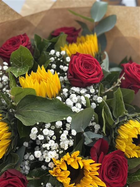 This stunning hand-tied bouquet combines the cheerful warmth of golden sunflowers with the classic romance of deep red roses. The arrangement features 6-7 vibrant sunflowers with their distinctive dark centers and bright yellow petals, beautifully paired with rich burgundy red roses for a striking color contrast.