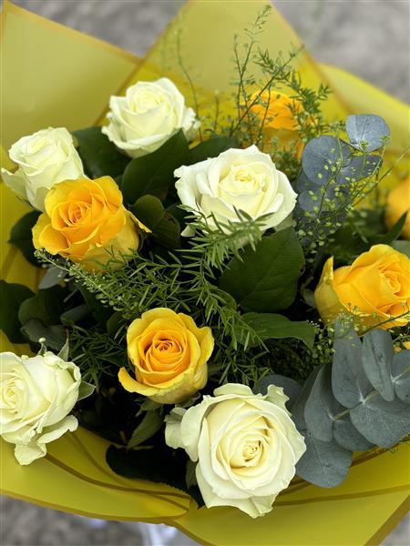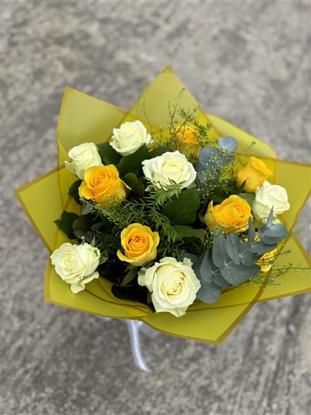 Brighten someoneβs day with this beautifully arranged hand-tied bouquet, featuring a delightful mix of fresh yellow and ivory roses. Expertly paired with lush greenery and eucalyptus, this bouquet combines elegance with a cheerful pop of colour. Wrapped in vibrant yellow paper, itβs the perfect gift for birthdays, celebrations, or simply to bring a smile.