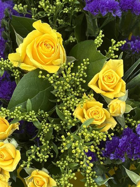 The pairing of yellow and purple is a timeless color combination that creates maximum visual impact - these complementary colors make each other pop beautifully. Yellow symbolizes friendship and joy, while purple adds sophistication and depth, making this bouquet perfect for a wide range of occasions.