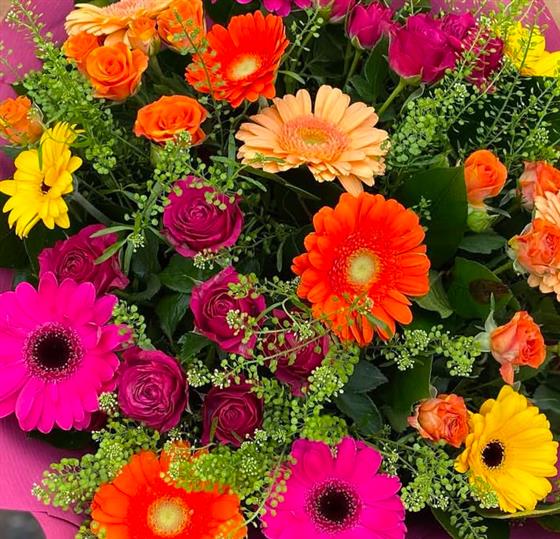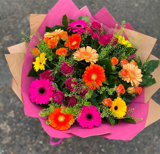 This bouquet is a vibrant, hand-tied arrangement featuring a lively mix of germinis in bold shades of hot pink, orange, and yellow, paired beautifully with delicate clusters of spray roses that add texture and charm. The combination of the large, daisy-like germinis and the smaller, rounded spray rose blooms creates a striking balance of shapes and sizes. Lush greenery is woven throughout, bringing freshness and contrast, while the bouquet is finished with a stylish pink wrap that enhances the bright, cheerful tones