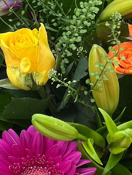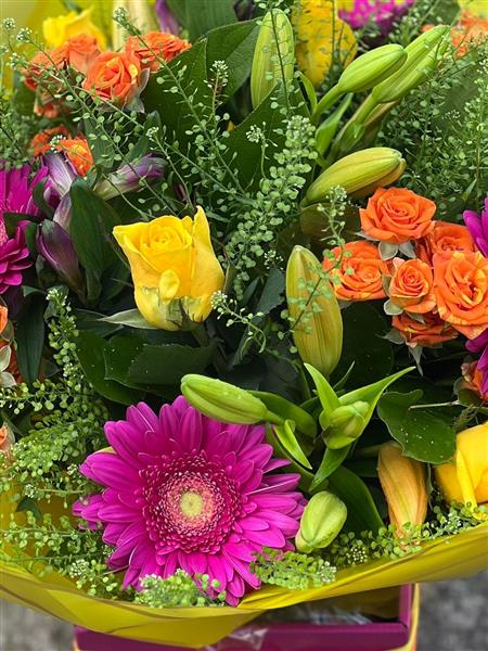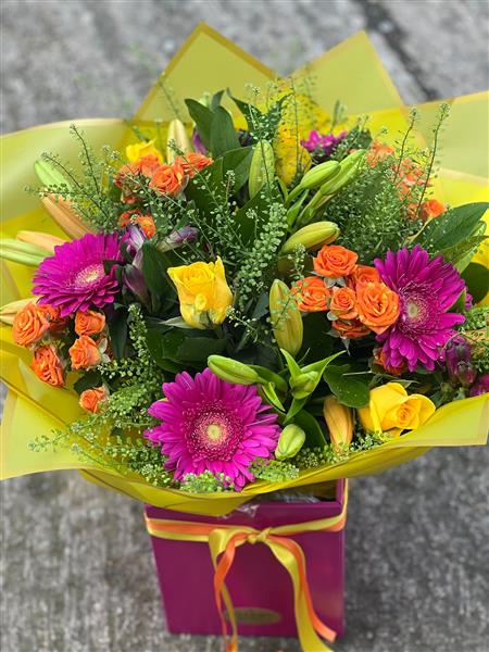 Bring joy to any occasion with this vibrant hand-tied bouquet. Featuring bold pink gerberas, sunny yellow roses, and warm orange spray roses, this arrangement is beautifully wrapped in luxury paper for a stunning finish. Perfect for birthdays, celebrations, or simply to brighten someoneβs day, this fresh flower bouquet combines elegance with a burst of colour