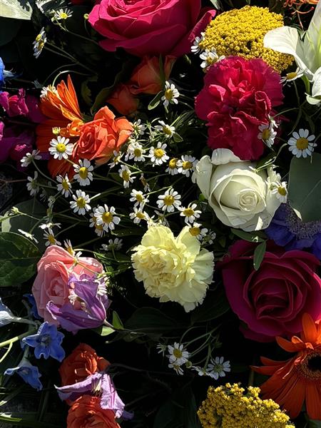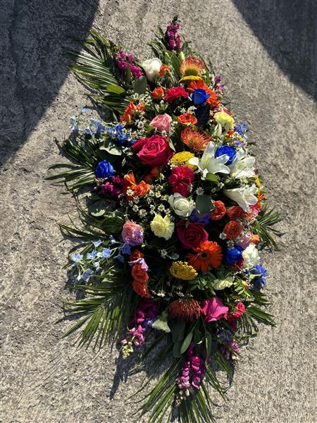 A vibrant mixed casket spray, with a lovely selection of seasonal flowers and foliage.