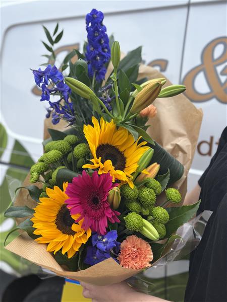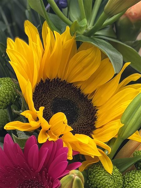 Make a bold statement with this spectacular hand-tied bouquet bursting with color and texture. This eye-catching arrangement combines the sunny warmth of sunflowers with rich jewel tones and delicate blooms to create a truly memorable gift.
