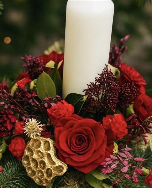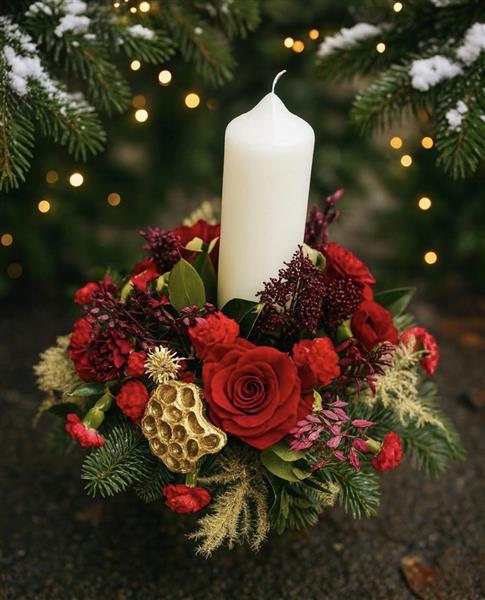 This stunning Christmas candle arrangement creates an elegant focal point for your holiday celebrations. At its heart stands a classic ivory pillar candle, surrounded by a luxurious collar of festive blooms and natural elements.