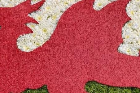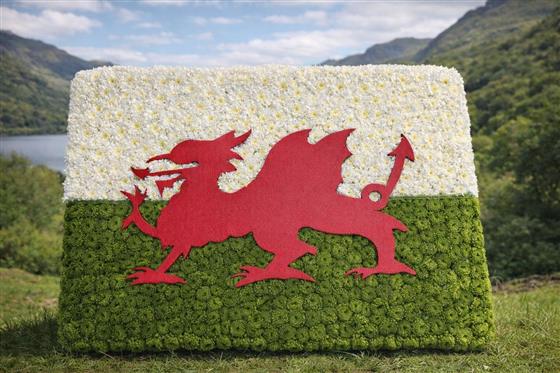 A beautiful large-scale tribute recreating the iconic Welsh flag, crafted entirely from fresh flowers. The upper half features white chrysanthemums, the lower half lush green button chrysanthemums, with the bold Red Dragon mounted proudly across the centre.