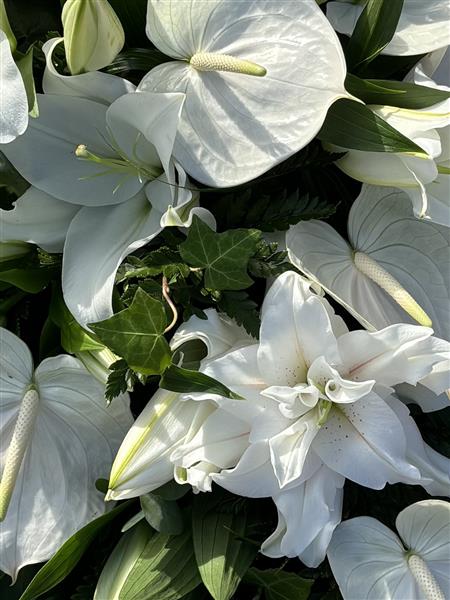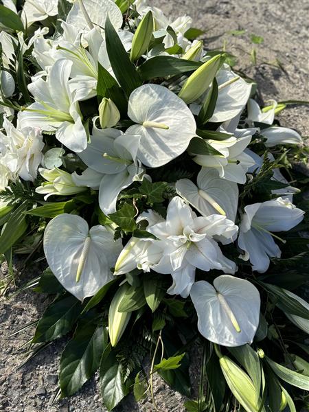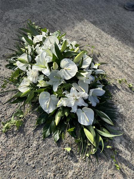 A casket tribute of all white lily and white Anthurium with seasonal greenery.