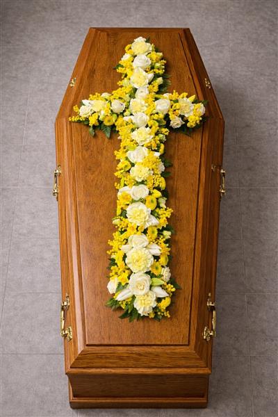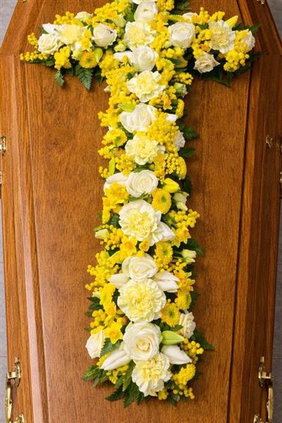 A elegant floral cross laid on a warm oak coffin, beautifully arranged with white roses, carnations, and mimosa in soft shades of yellow and white amongst other seasonal flowers. A timeless and peaceful tribute, perfect for conveying hope, comfort, and love